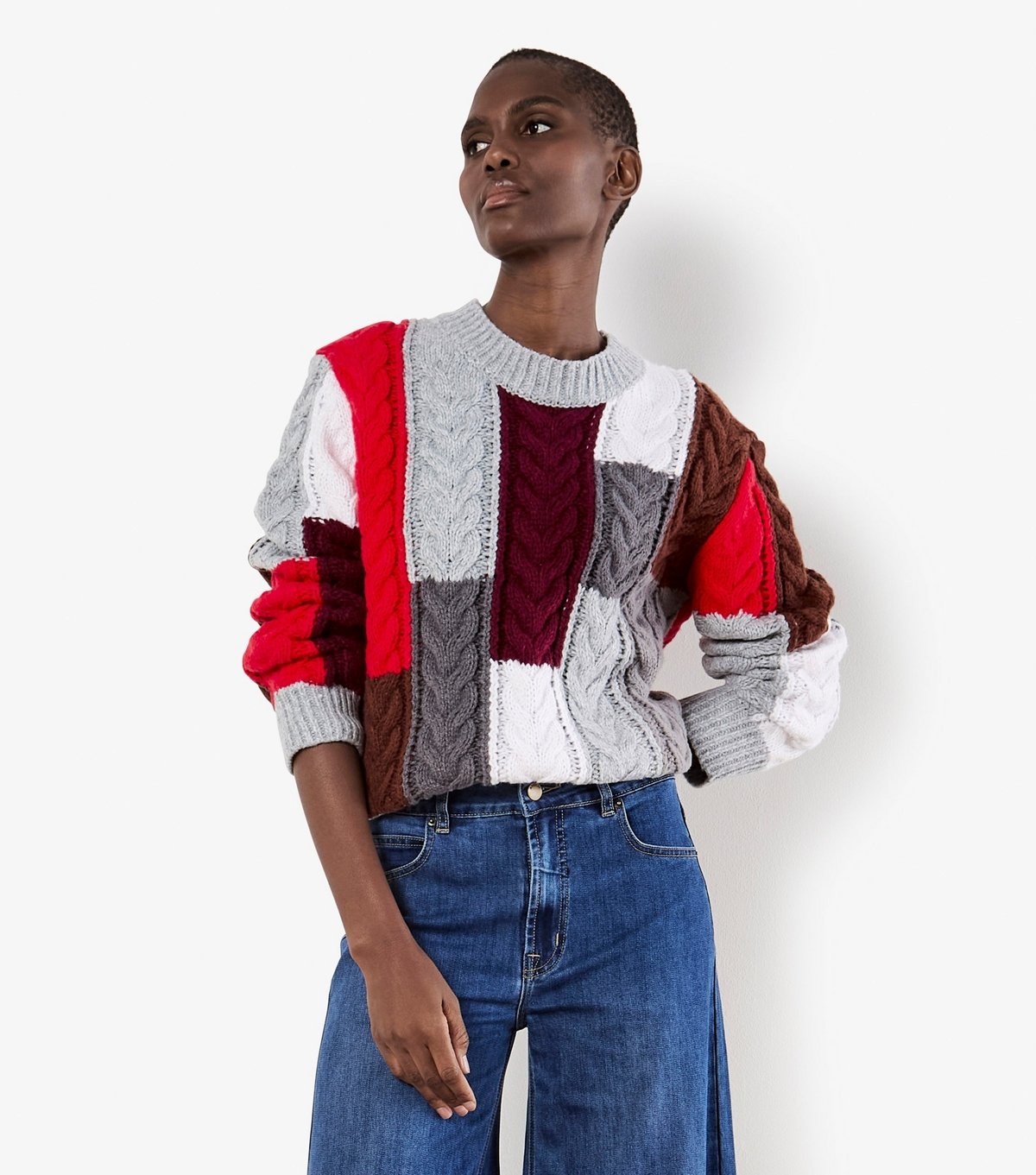 The Apricot Grey Cable Colour Block Chunky Knit Jumper is available in sizes 10, 12, 14, 16, 8.