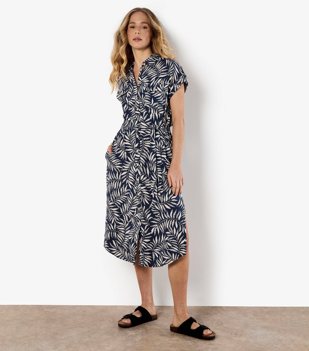 Stylish Navy Leaves Print shirt dress from Apricot. Features a collared neckline, short sleeves, and side slip pockets. The midi length and high-low curved hem add a touch of elegance. Perfect for casual outings.
