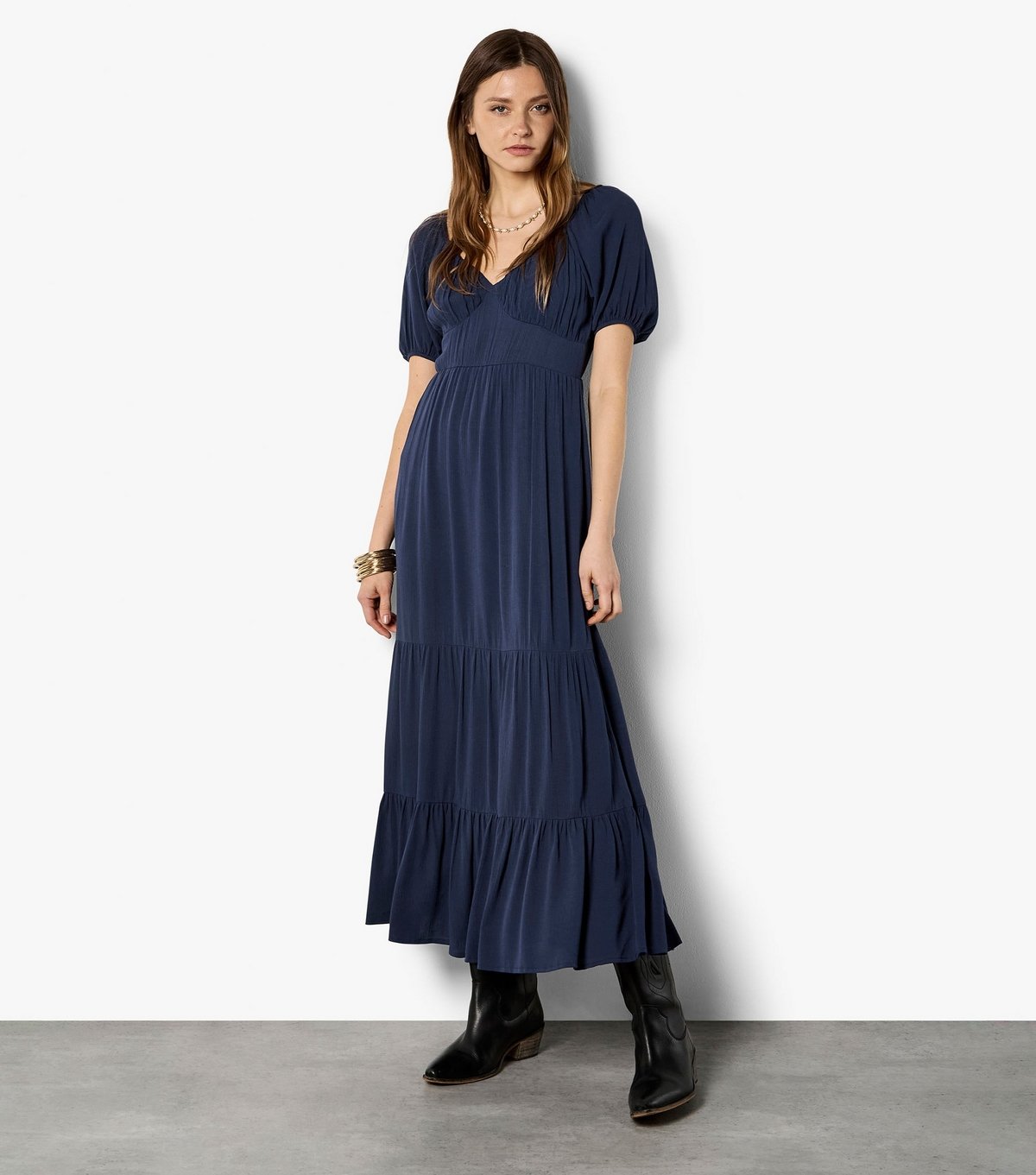 This navy blue milkmaid maxi dress by Apricot features a V-neckline and short puff sleeves for a touch of romance. The woven fabric and slightly gathered skirt create a flattering silhouette. Ideal for weekend outings or cooler evenings.