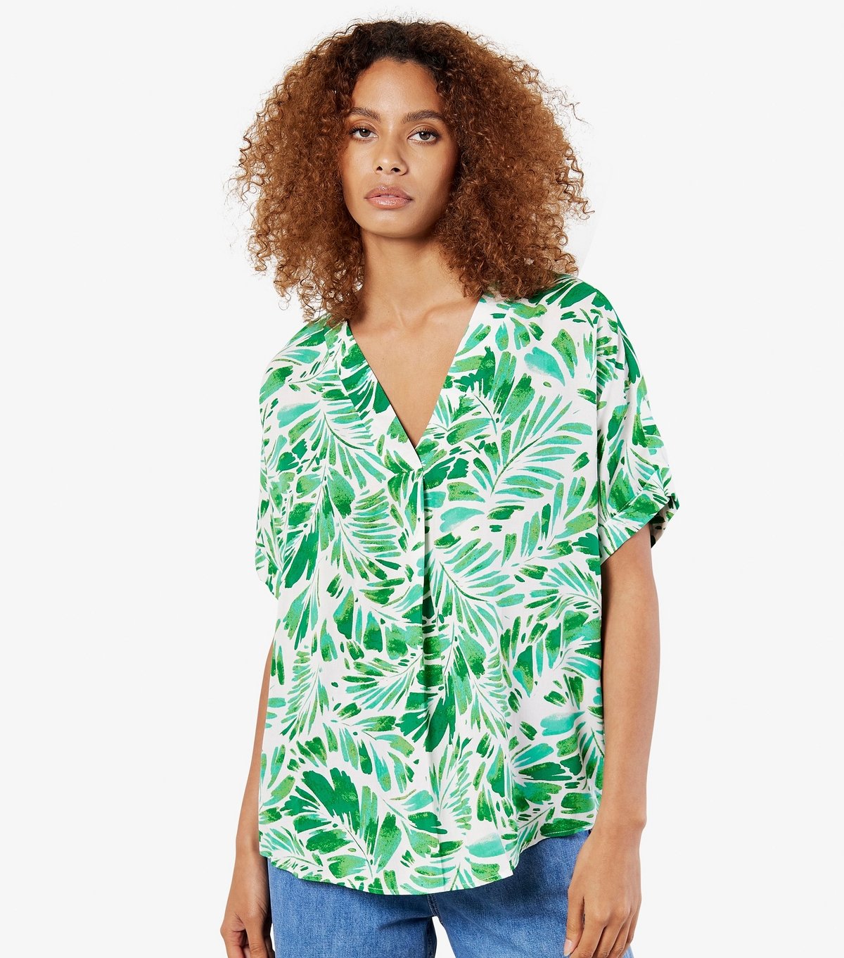 Stylish tropical print top in off white and green. Features a V-neckline and short roll sleeves. The pleated details add a touch of elegance. Ideal for casual outings or beachwear.