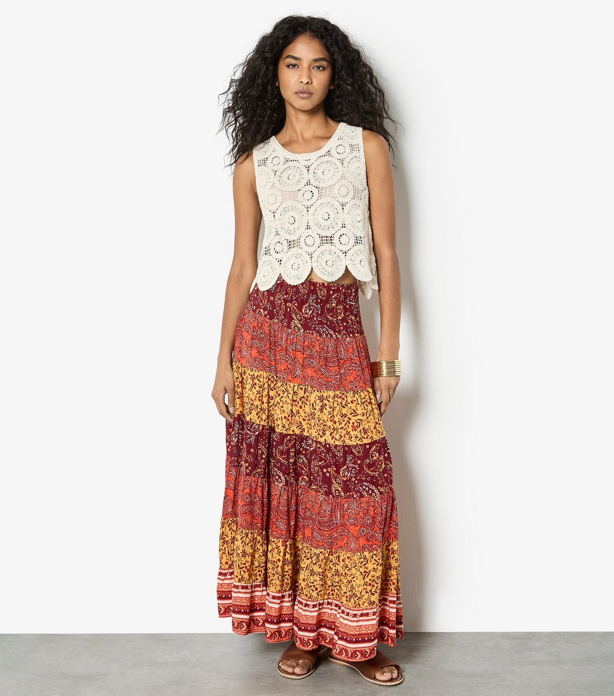 Vibrant maxi skirt with a mix of prints and colours. Perfect for adding a pop of colour to your everyday wardrobe. Features a relaxed fit and woven fabric for comfort.