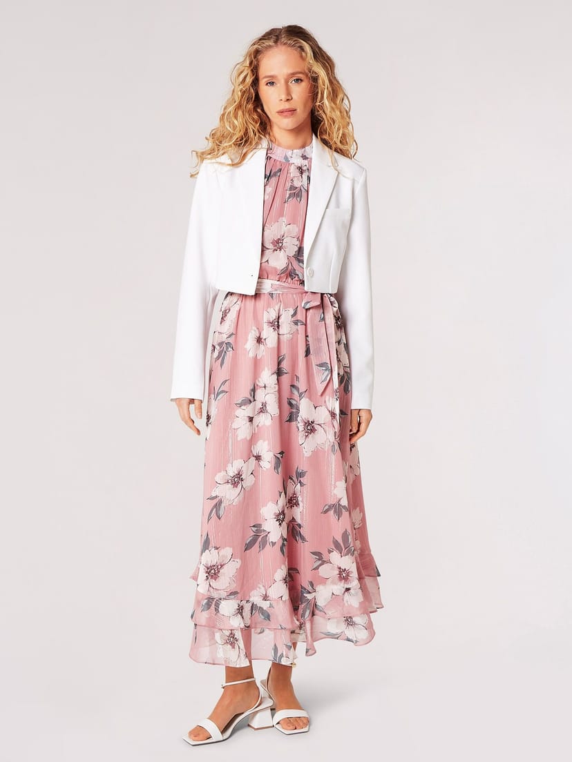 The Apricot Pink Floral Shimmer Midi Dress by Apricot is ideal for garden party, outdoor event, casual.