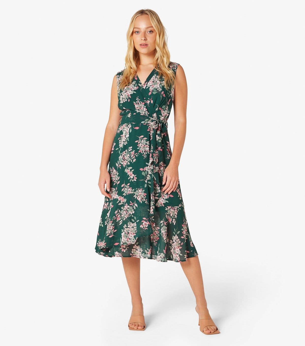 The Apricot Green Floral-Print Midi Wrap Dress by New Look is available in sizes 12.