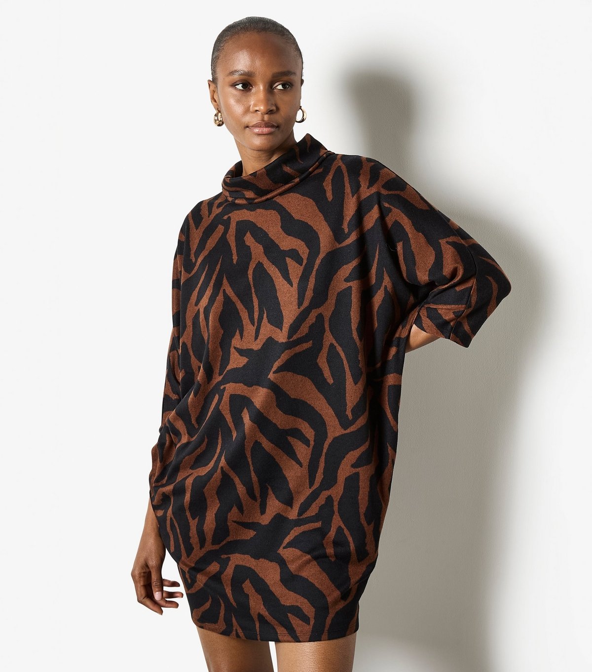 This cocoon dress from Apricot features an all-over zebra print. Made from woven fabric, it has a high neck and 3/4 length sleeves. Ideal for cooler seasons.