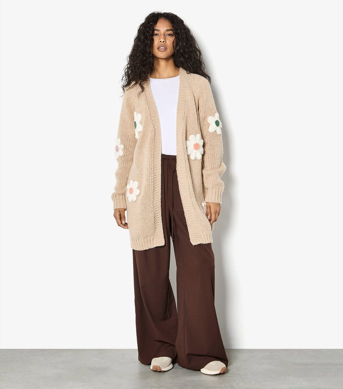Charming Apricot cardigan in stone featuring 3D daisy embroidery and ribbed trims. The relaxed fit and longline length make it perfect for casual wear.