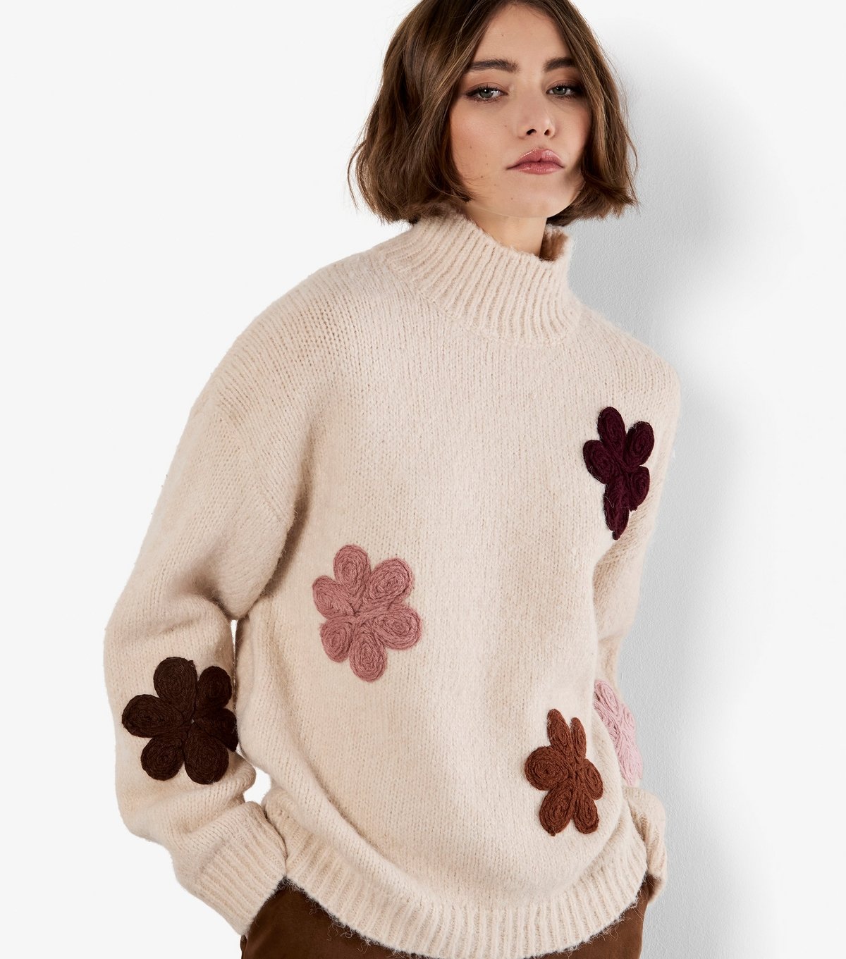 Charming Apricot jumper in stone featuring floral embroidery on a relaxed fit silhouette. Ideal for casual and everyday wear.