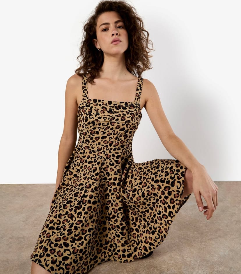 See all outfit ideasThis Apricot dress features a leopard print with a flared fit and mini length. The square neckline and wide straps add a unique touch. Perfect for casual or evening wear.