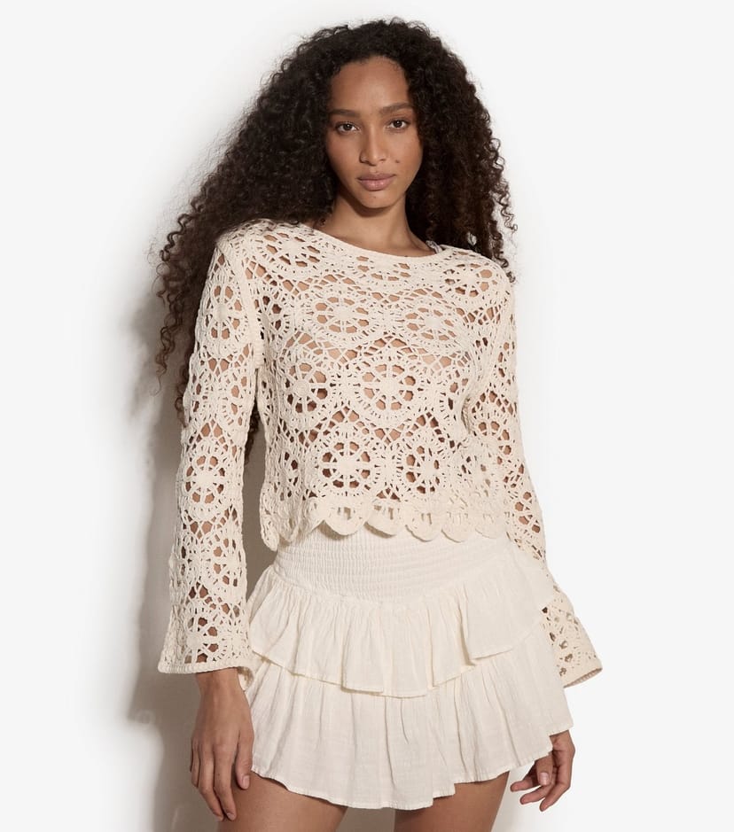 Embrace a boho feel with this crochet knit top from Apricot. A fun piece for layering during the warmer months, it has flared cuffs and a scalloped hem.