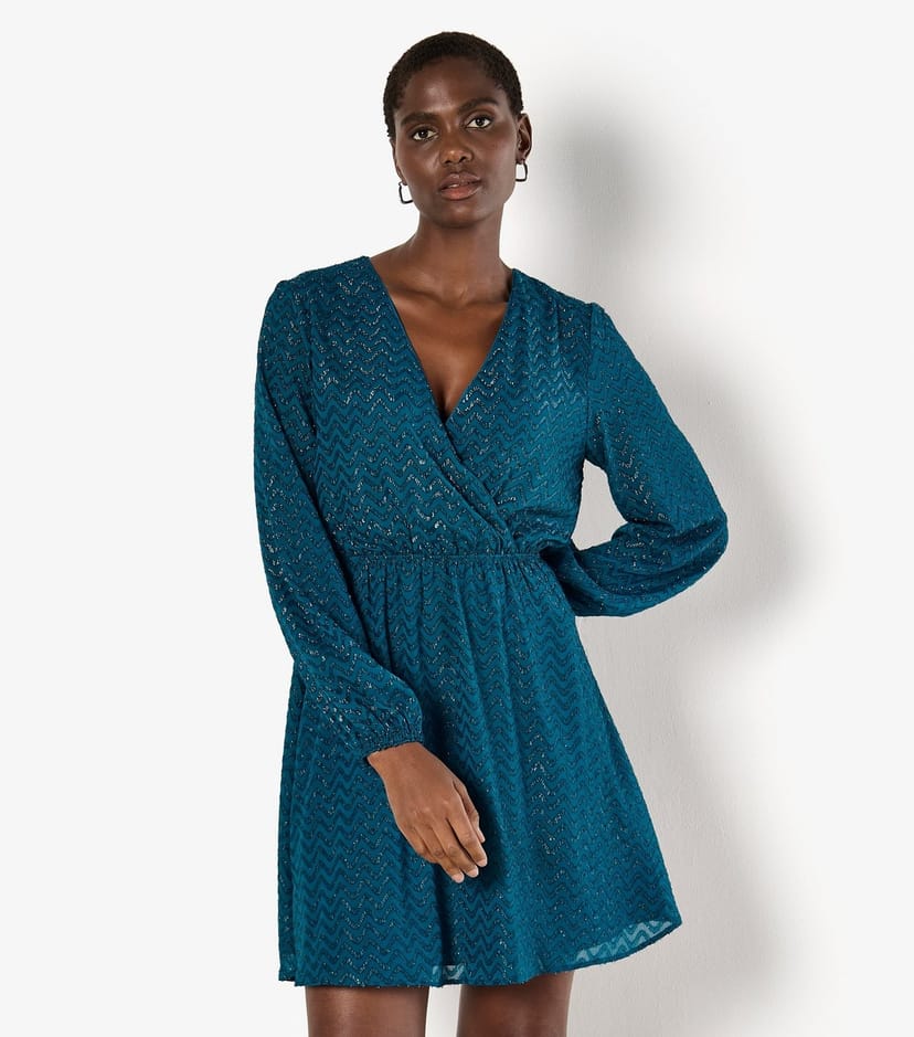 Stylish Teal jacquard wrap mini dress with a flattering fit and flare silhouette. Features a V-neckline and long sleeves with elasticated cuffs. The dress is secured with a waist tie for a perfect fit.
