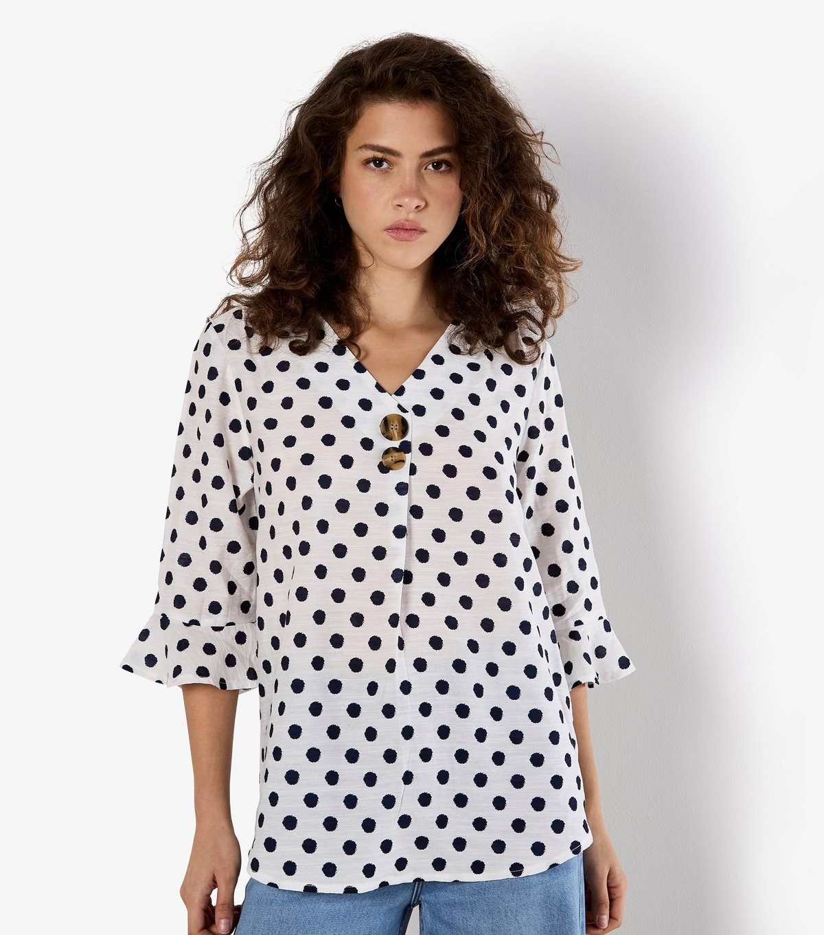 Playful polka dot v-neck top in white with a relaxed fit. Features 3/4 length sleeves and a button closure. Ideal for casual occasions.