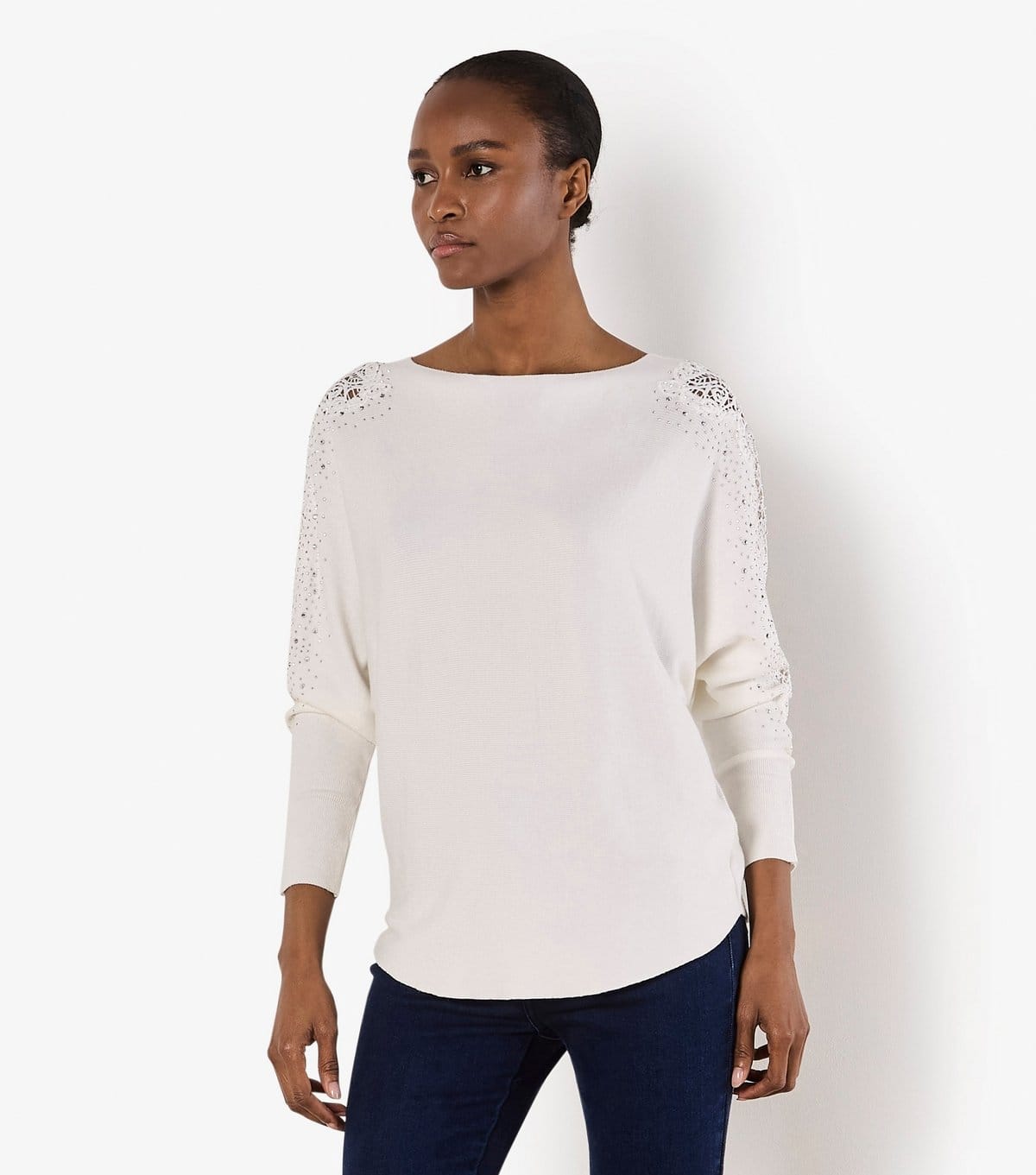 The Apricot White Lace Stud Arm Batwing Jumper is ideal for casual, everyday.