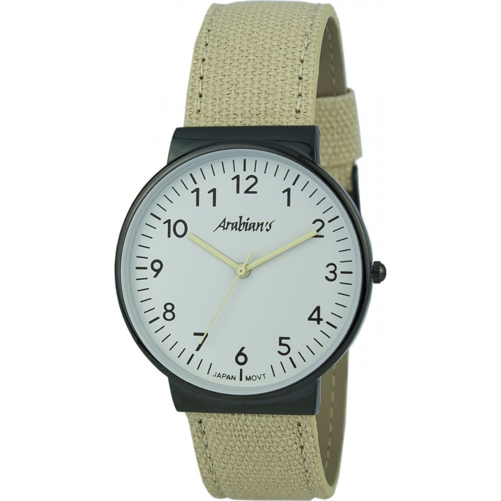 Stylish Beige Arabians men's watch with a 40mm case and a textured fabric strap. Features a classic round dial with Arabic numerals and yellow hands. Made with durable materials for long-lasting wear.