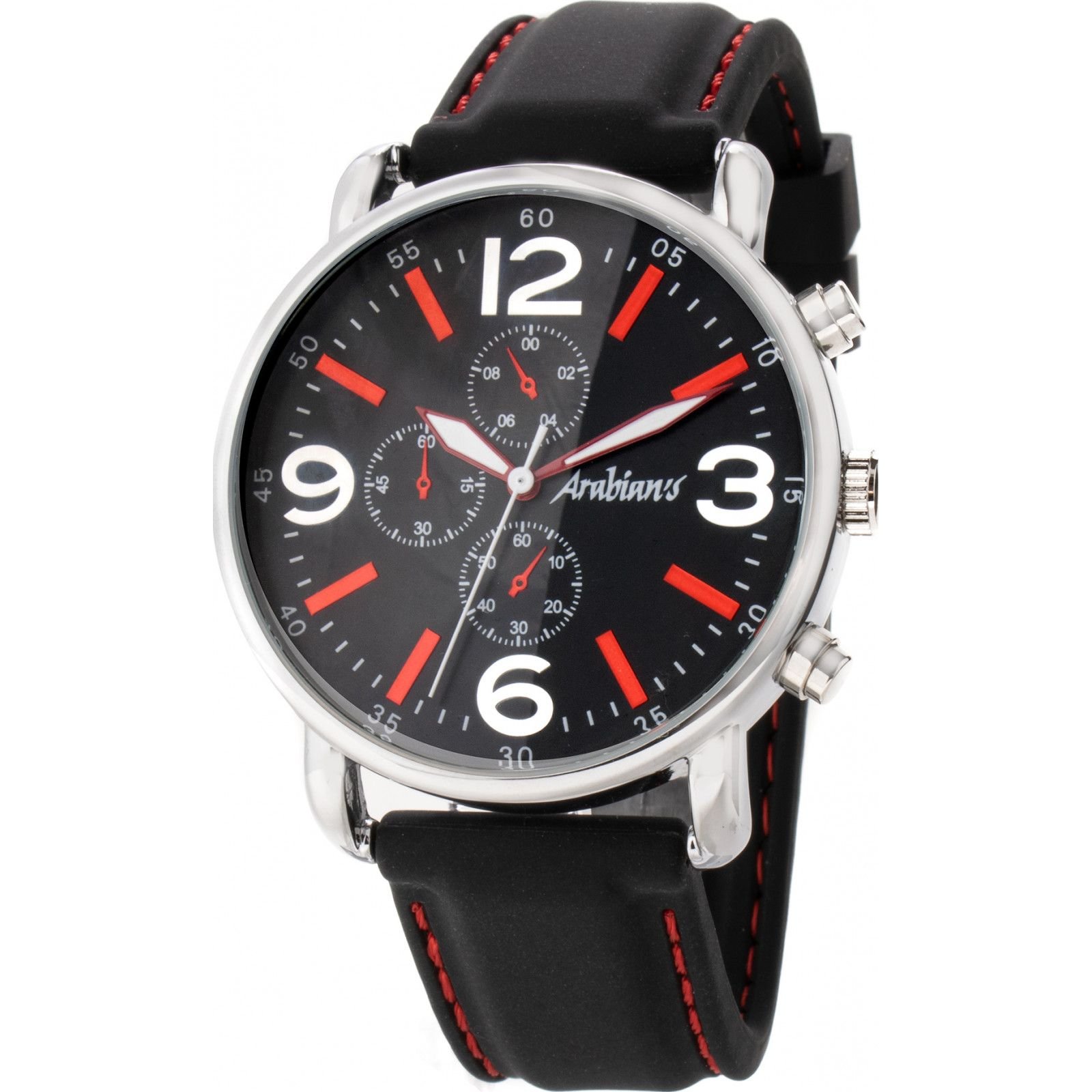 Stylish Arabians men's watch with a black dial and silver-tone case. Features a black leather strap with red stitching and bold red accents on the hour markers and hands. Perfect for a modern and sophisticated look.
