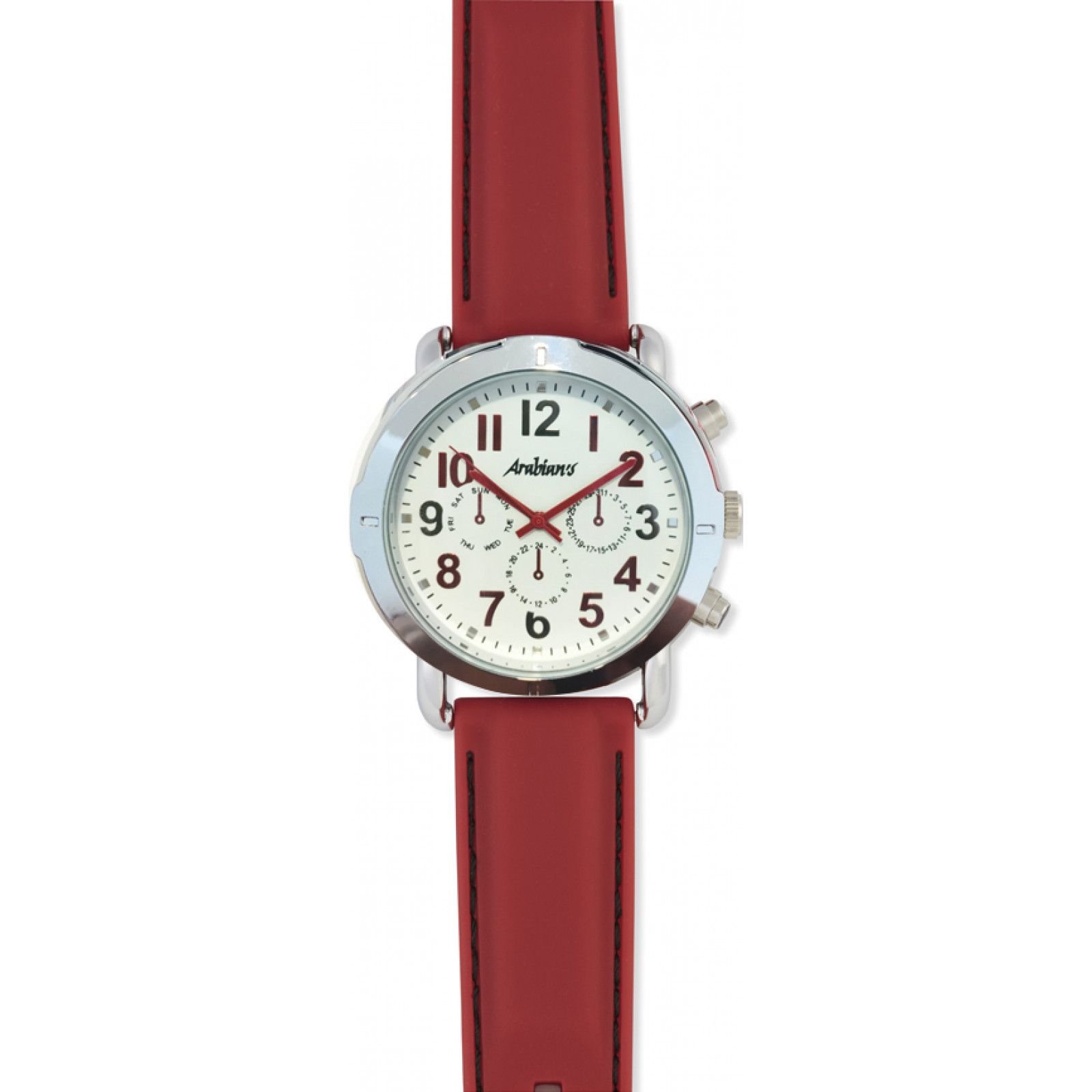 Stylish Arabians men's watch with a red leather strap and a silver-tone case. Features a classic analog display with red hands and numerals. Perfect for everyday wear.