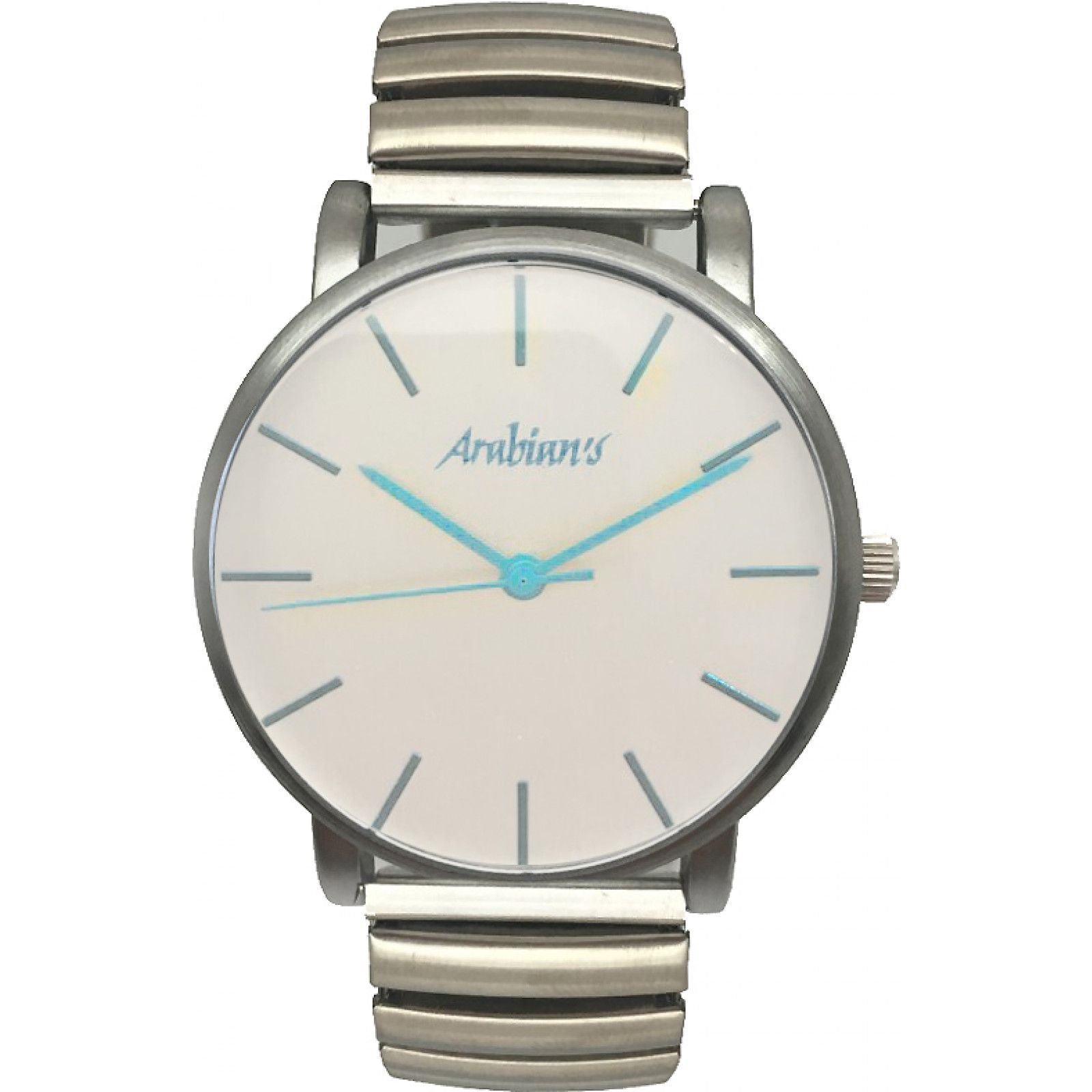 Elegant silver quartz watch from Arabians with a sleek metal band and a clean white dial. Features blue hands and markers for easy readability. Perfect for everyday wear or formal occasions.