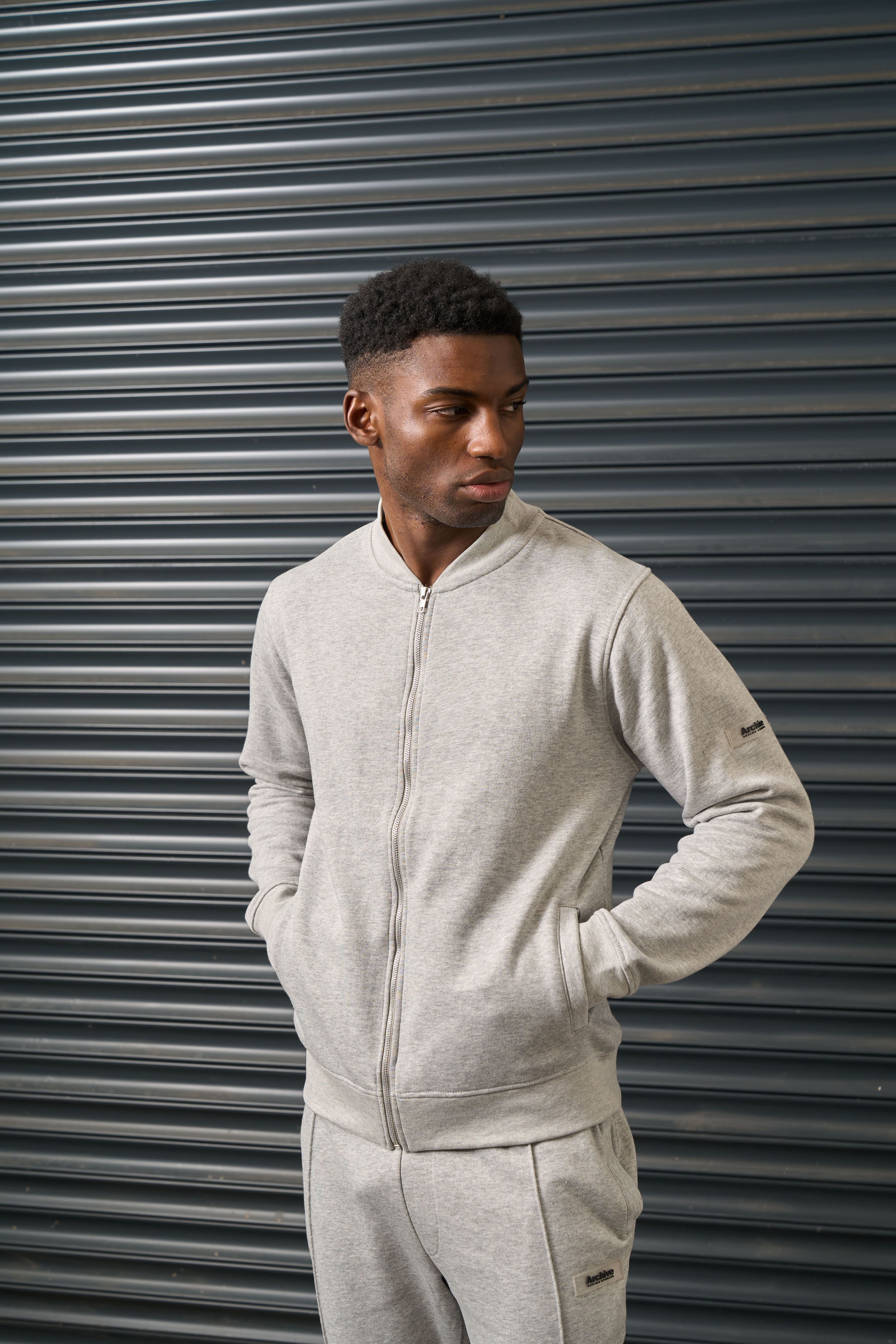 Stylish grey tracktop by Archive Design Studios made from a blend of 65% polyester and 35% cotton. Features a ribbed collar, cuffs, and hem, welt pockets, and a branded rubber sleeve badge. The silver metal zipper adds a touch of luxury.