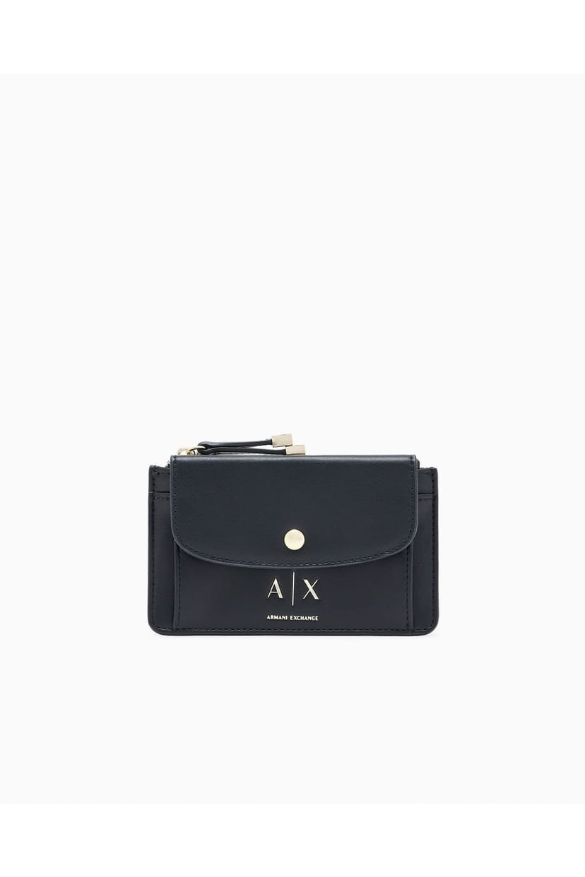 Compact mini wallet design with sleek front flap secured by a polished metal stud. Signature Armani Exchange A|X logo embossed on the front for distinctive branding. Multiple card slots for organised storage of essentials. Convenient top zip compartment for coins and small valuables.