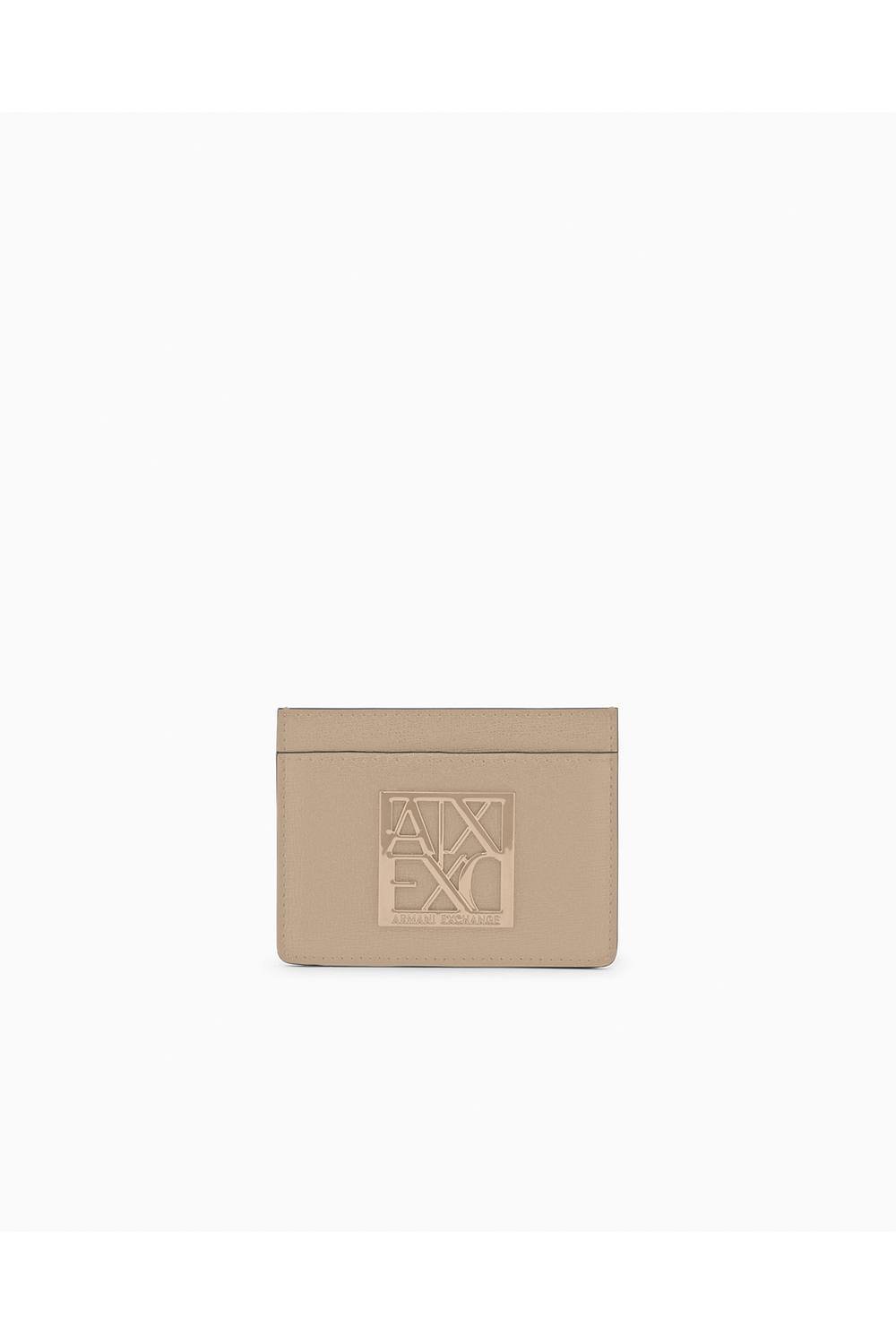 Sleek card holder in sand colour with embossed Armani Exchange logo. Compact design perfect for essential cards and minimal storage. Features multiple card slots for organised payment and identification storage.