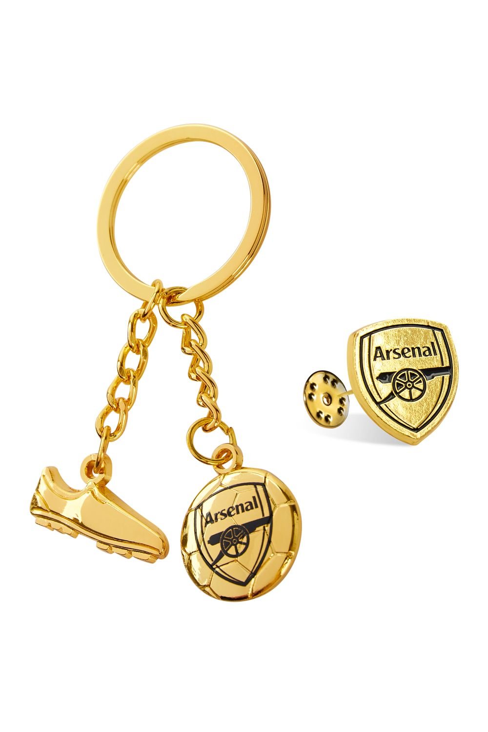 Elevate your fan status with our Arsenal F.C. keyring and pin badge gift set. Featuring a stylish football and football boot charm, along with the iconic Arsenal crest, this set is the ultimate expression of support for your favourite team. Perfect for die-hard fans.