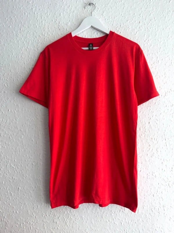 “Pair this red t-shirt with dark wash jeans and white sneakers for a casual everyday look.”