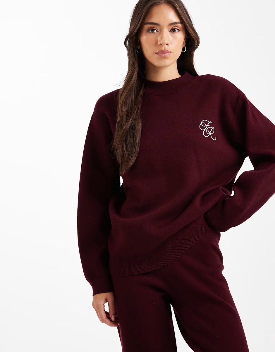 The 4th & Reckless jumper co-ord in burgundy features embroidered logo details. Perfect for a casual look, this piece combines comfort with a touch of style.