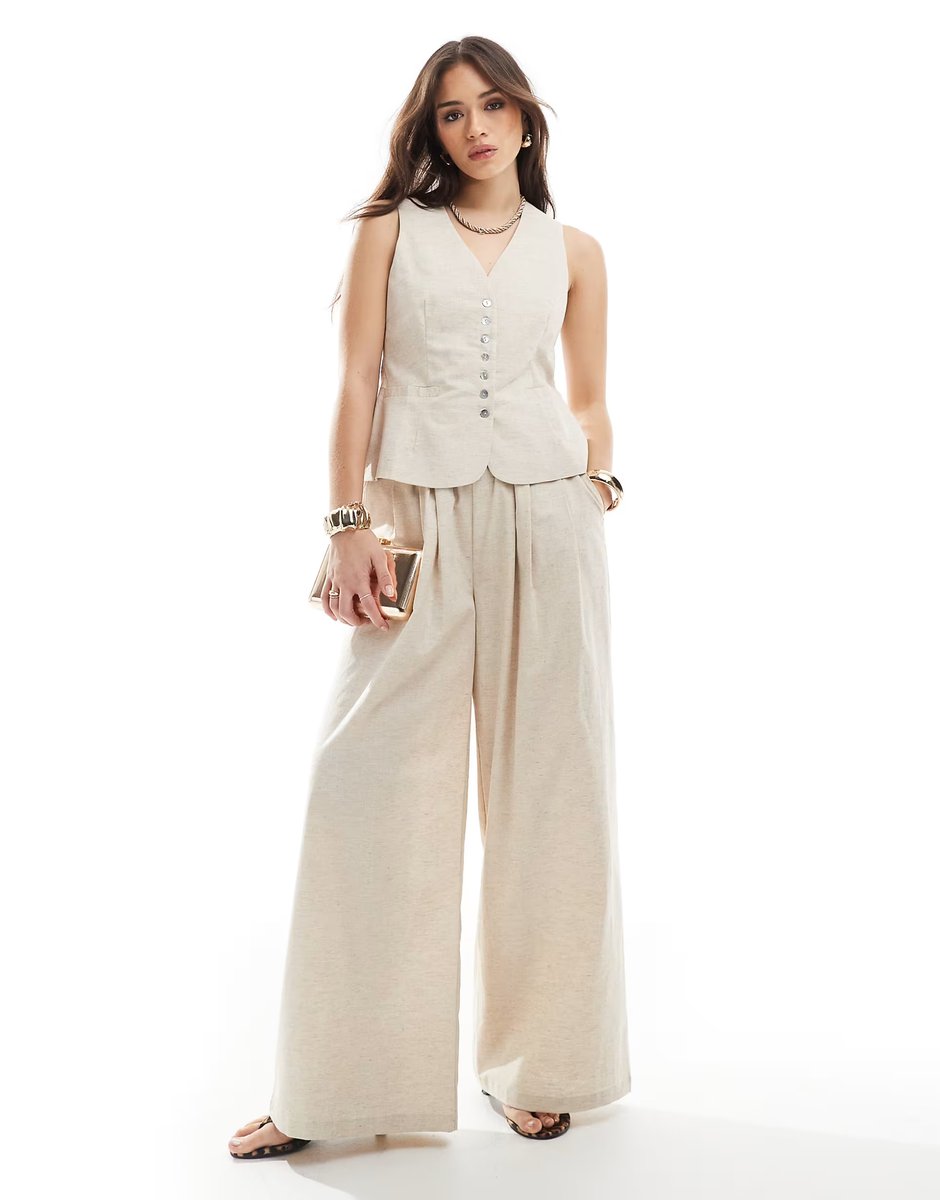 The 4th & Reckless linen blend tailored ruched waistband wide leg trousers co-ord in beige features a tailored fit and a ruched waistband for a flattering silhouette. Perfect for a casual yet stylish look.