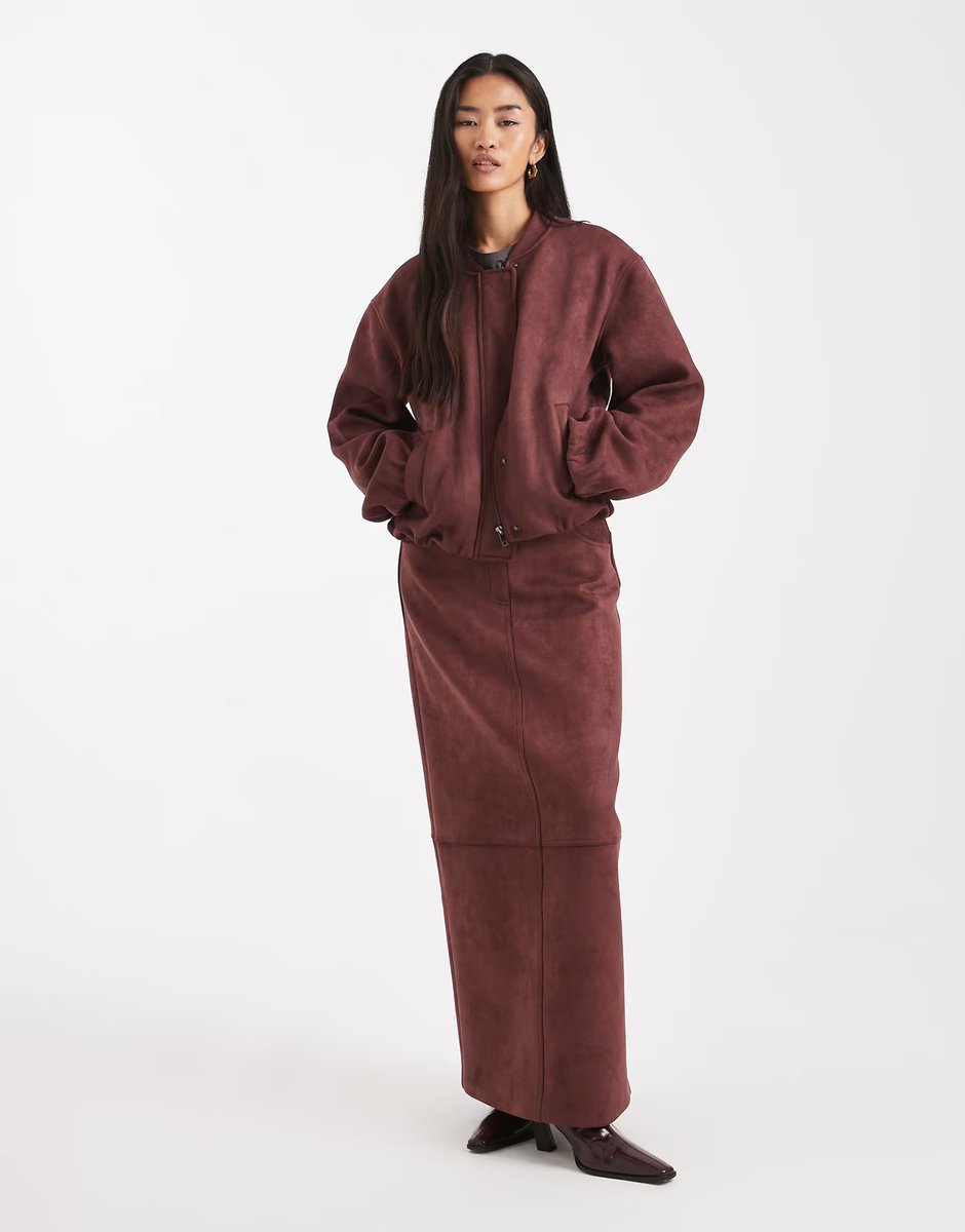 The ASOS Burgundy Faux Suede Bomber Jacket and Maxi Skirt Co-ord is ideal for casual, weekend, evening.
