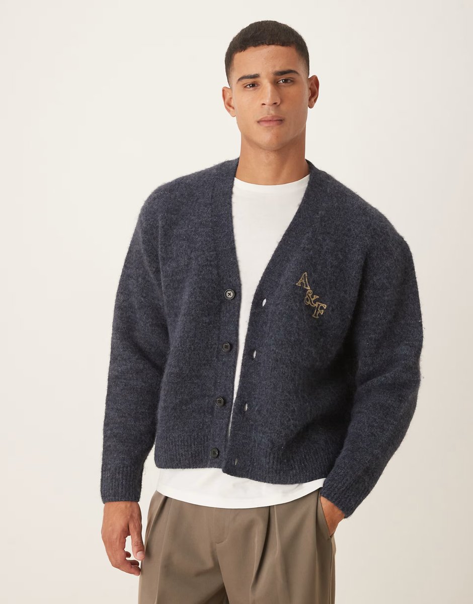 The ASOS Abercrombie & Fitch Oversized Logo Cardigan in Navy is available in sizes XXXL, XXL, XL, XS, L, M, S.