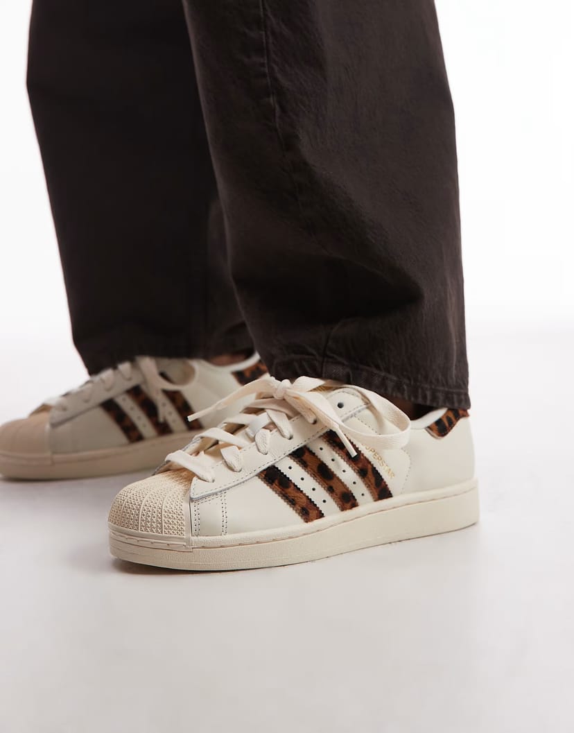 Stylish adidas Originals Superstar II trainers in white with leopard print pony hair. Perfect for a casual yet bold look.