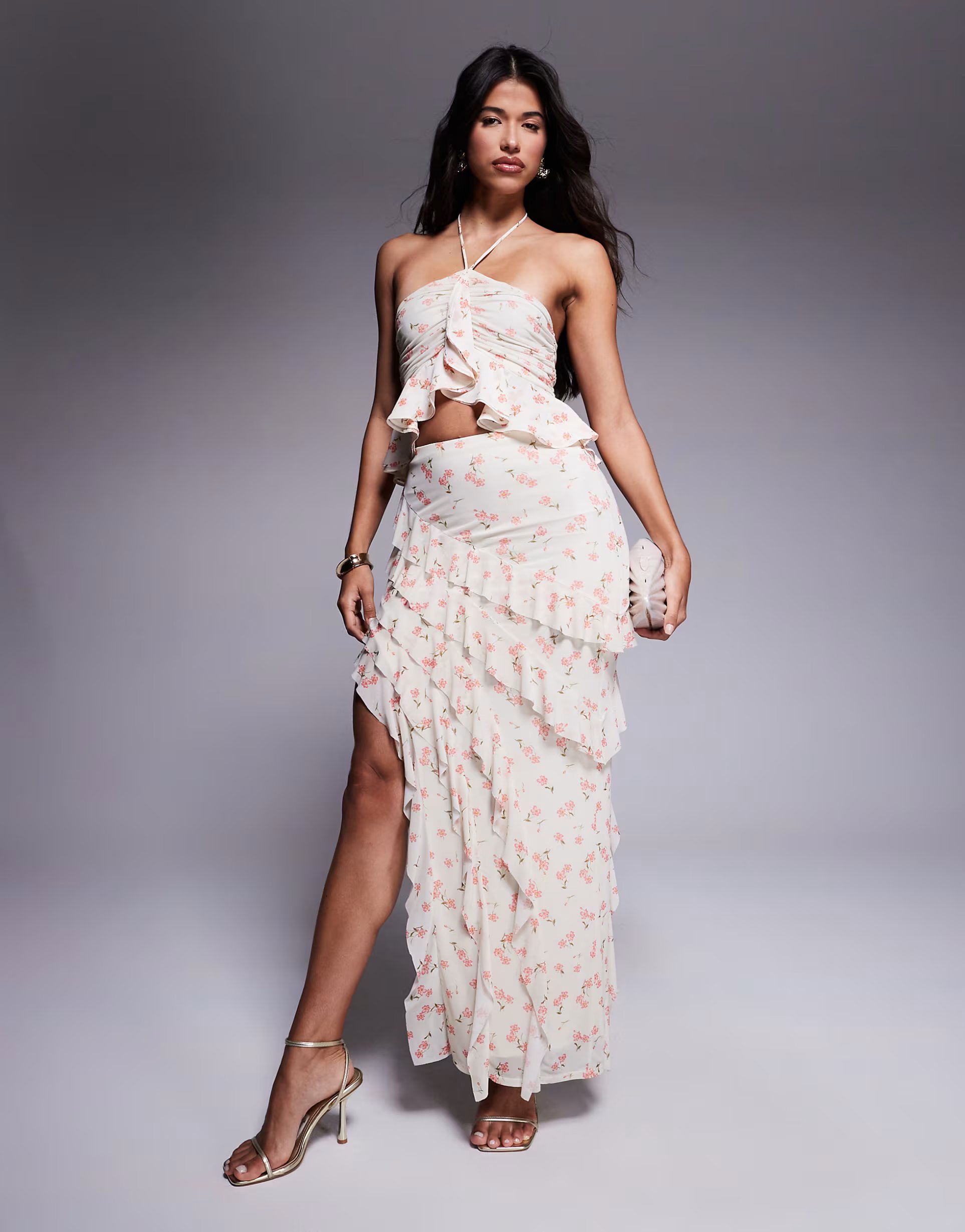 The ASOS AFRM Asymmetrical Ruffled Maxi Skirt in Ditsy Floral is ideal for beach, casual.