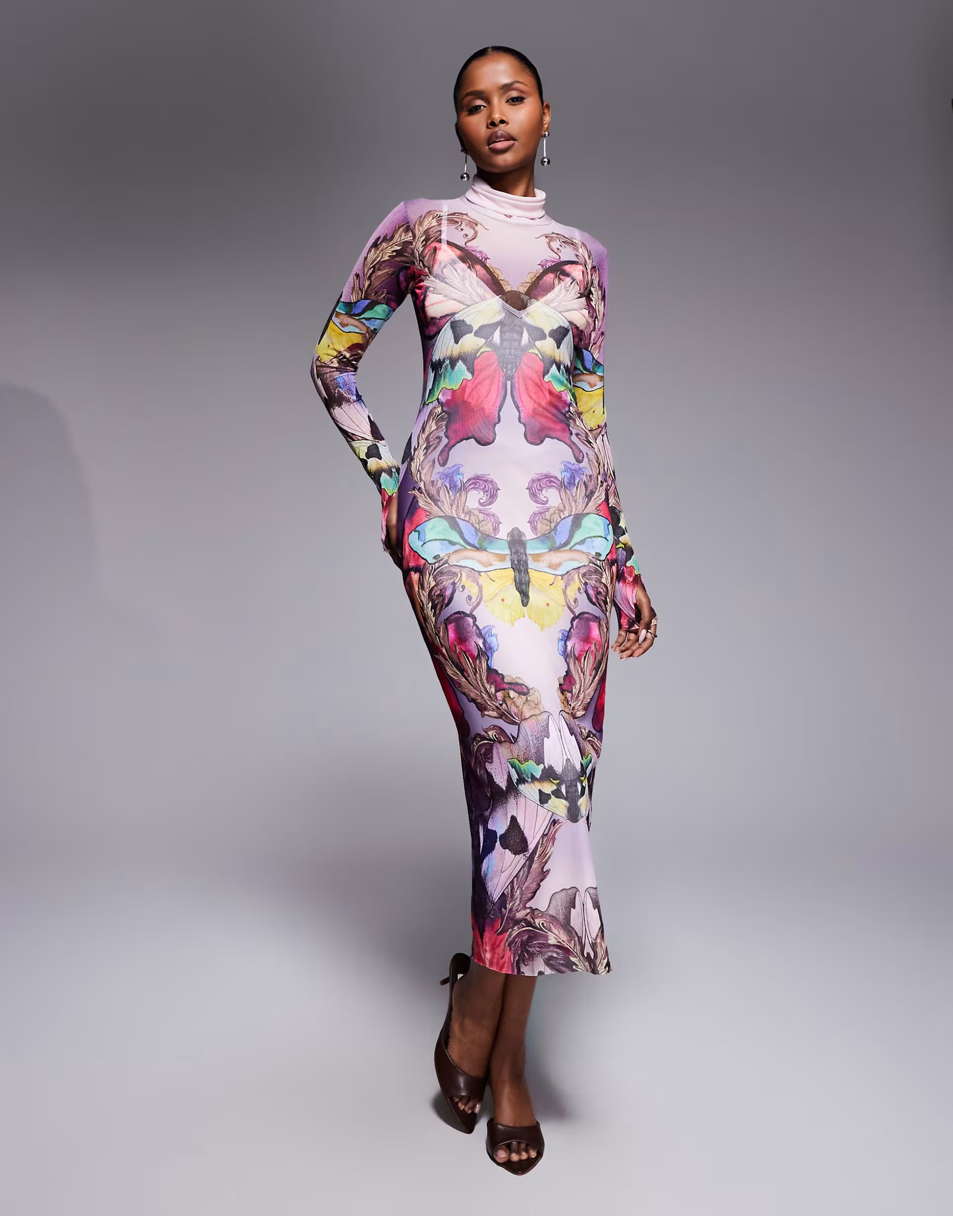 The ASOS AFRM Ornate Turtleneck Midi Dress in Purple is made from mesh.