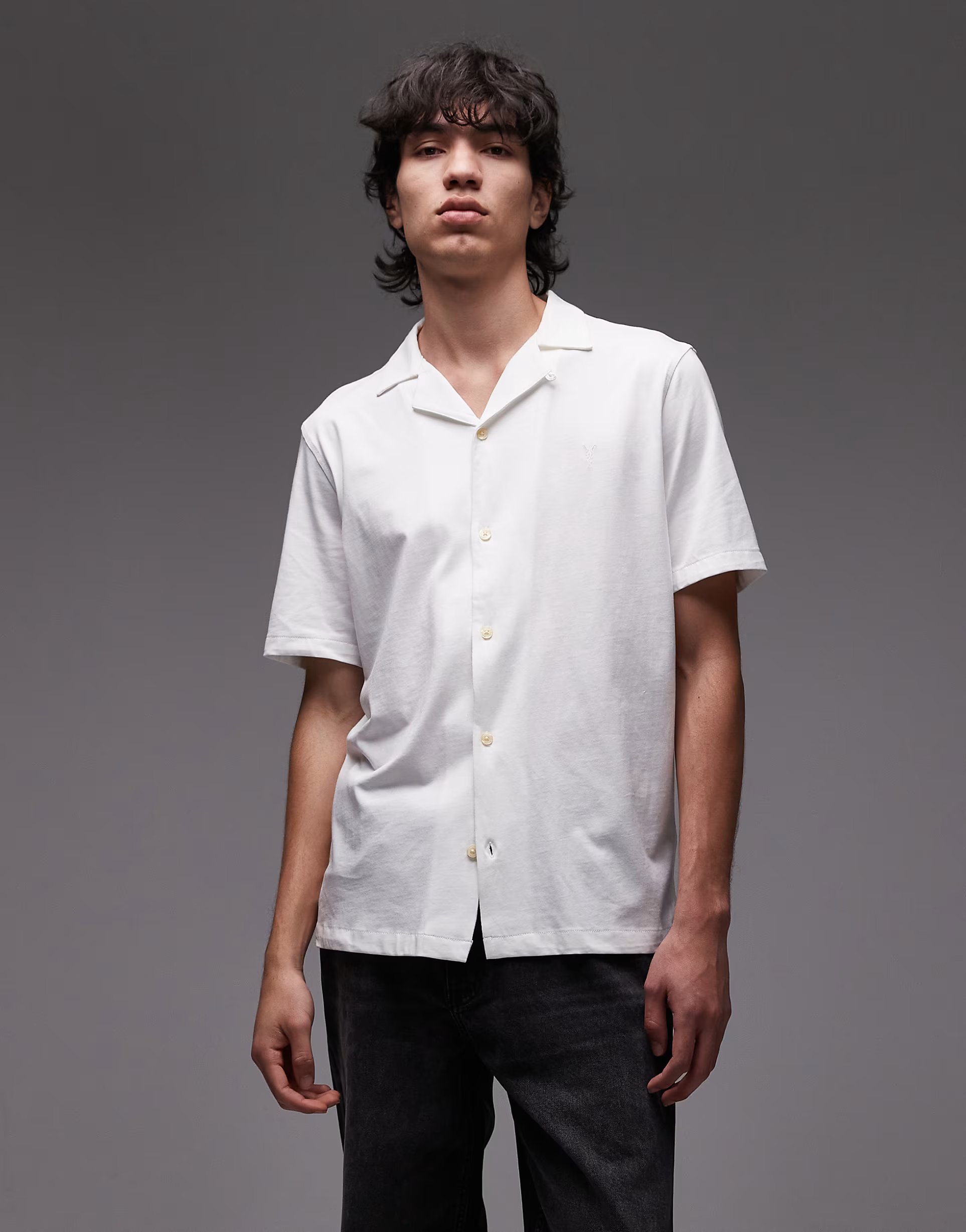 The AllSaints Hudson short sleeve logo shirt in white is a crisp and clean option for casual occasions. Featuring a button-down front, it's perfect for a smart-casual look.