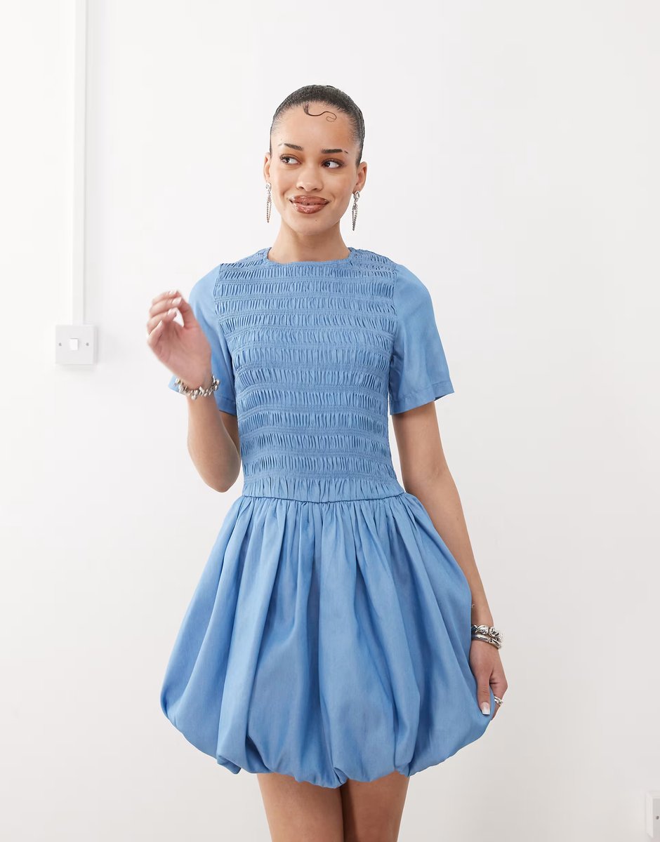 This chic puffball mini dress from Amy Lynn Eleanor in blue chambray features a flattering A-line silhouette and is crafted from a lightweight, breathable fabric. Perfect for a casual going-out look, its soft, textured material adds a touch of whimsy to any outfit.
