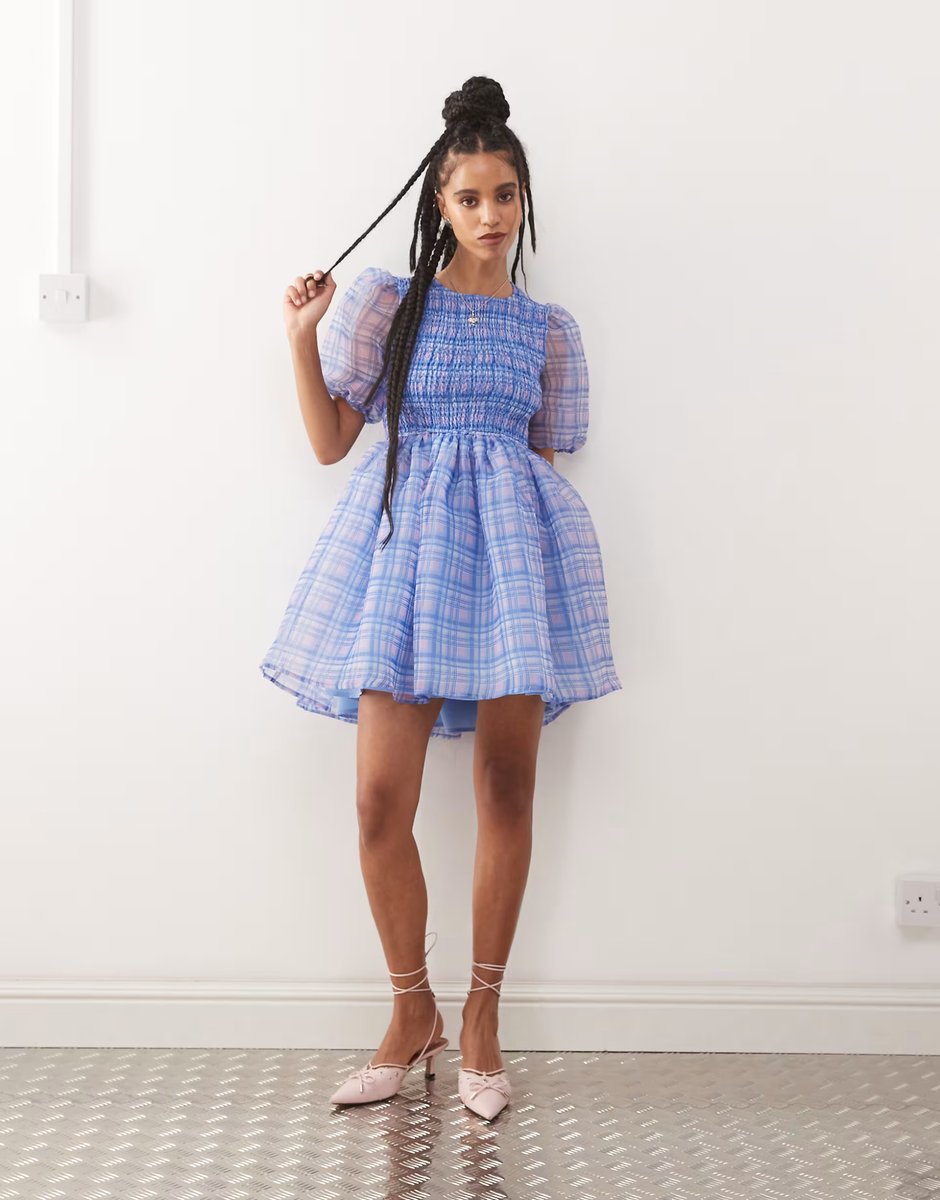 Blue and white plaid organza puffball mini dress by Amy Lynn with a cutout back. Designed in a vibrant blue and white plaid pattern, this mini dress features puff sleeves and a playful, flirty silhouette. Crafted from lightweight organza, it offers a delicate and airy feel perfect for warm weather. The cutout back adds a touch of modernity and allure.