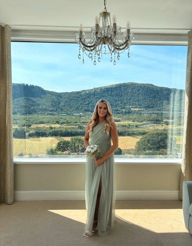 Elegant sage one-shoulder maxi dress crafted from tulle, perfect for formal occasions with its flowy, airy design.