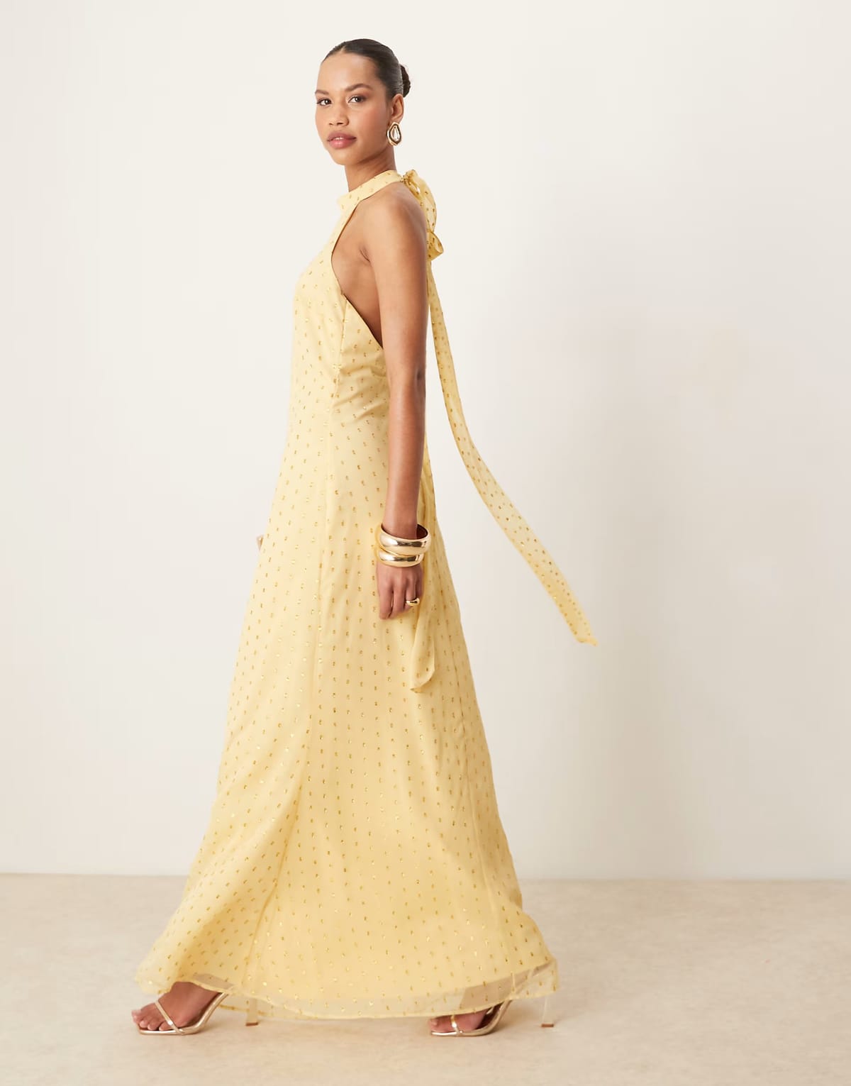 The ASOS Butter Yellow Foil Halter Neck Maxi Dress is ideal for party, beach, summer event.