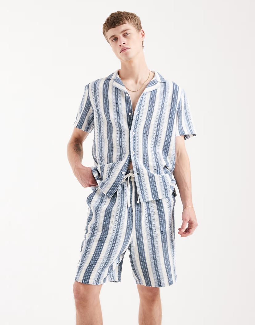 Casual ASOS short in blue stripe crochet fabric with a relaxed fit. Features a button-front and drawstring waist for a comfortable and stylish look. Ideal for summer outings.