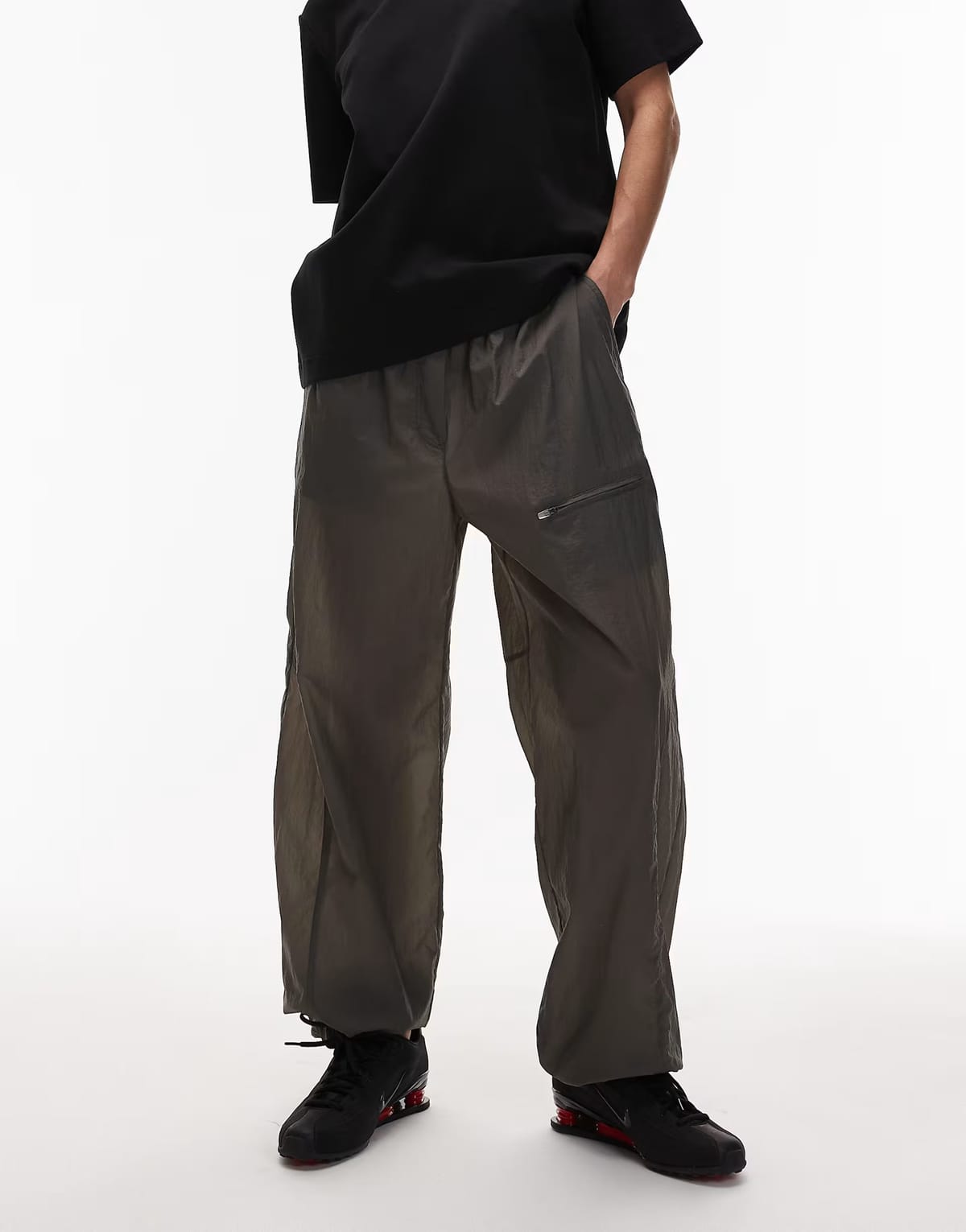Stylish ASOS ARKET dark grey parachute trousers with a utility-inspired design. Made from a matte, lightweight fabric with a drapey texture, these trousers feature a high waist, wide legs, and multiple pockets. Perfect for a casual, comfortable fit.