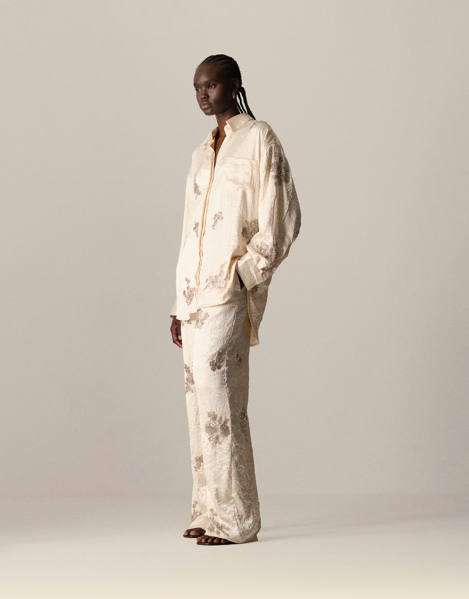 Designed with cream, floral embellished, full length, satin, straight leg, button closure, this co-ord is perfect for casual and evening occasions.