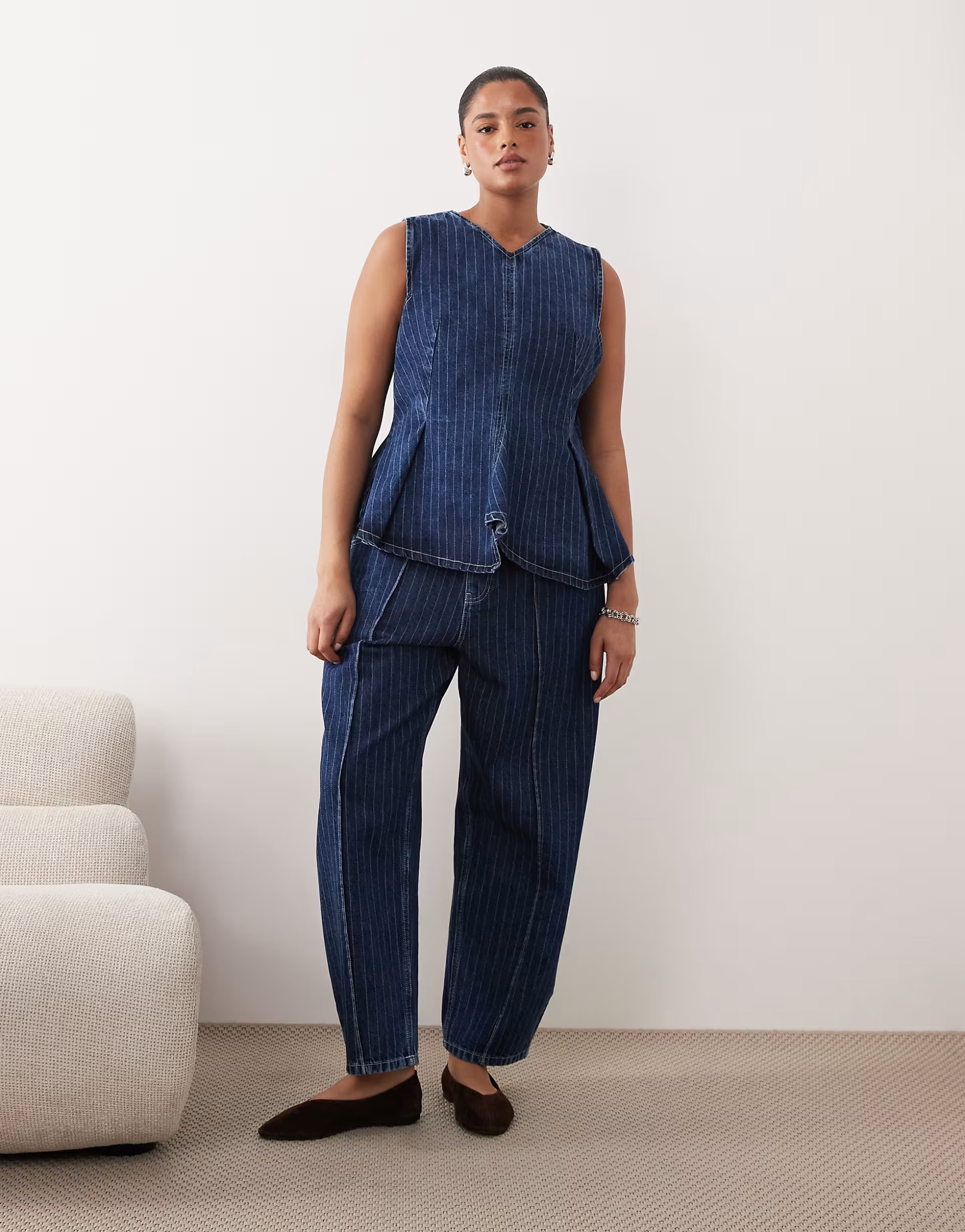 The ASOS Denim Pleated V-Neck Co-Ord in Washed Blue is ideal for casual.