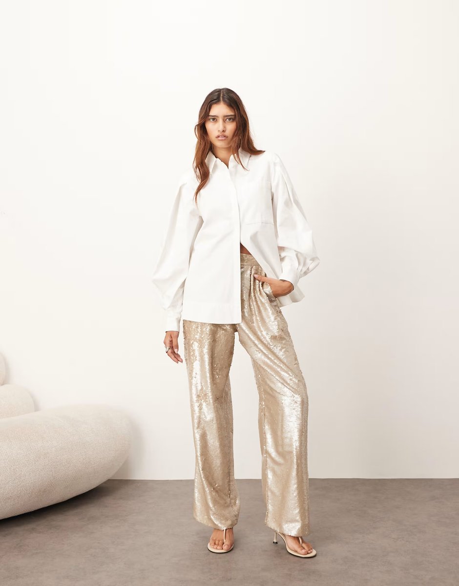 The ASOS Embellished Sequin Straight Leg Trouser in Cream is ideal for evening, elegant outings.