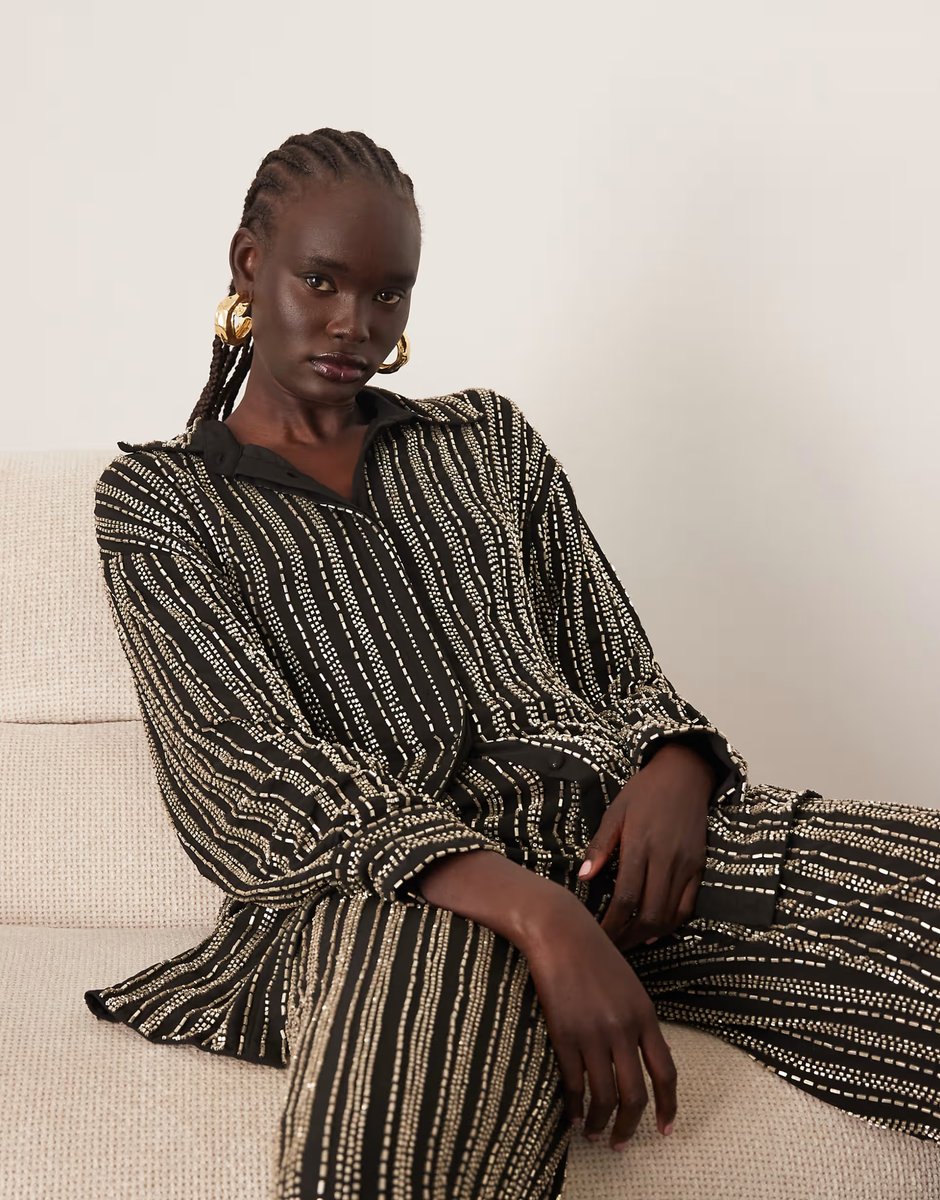 The ASOS Linear Beaded Oversized Shirt Co-ord in Black/Gold is ideal for casual, evening.