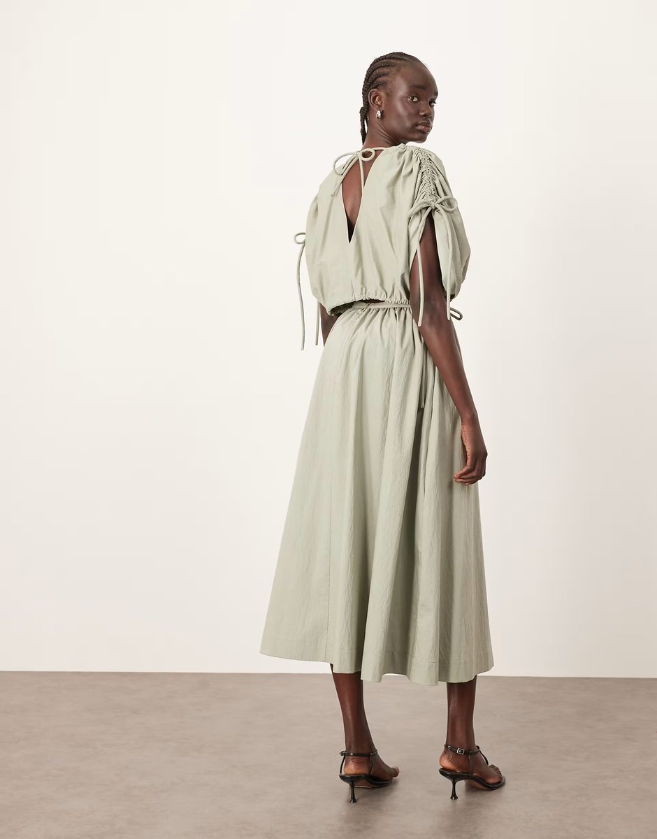 The ASOS Ruche Detail Plunge Top and Skirt in Sage is ideal for casual, smart-casual.