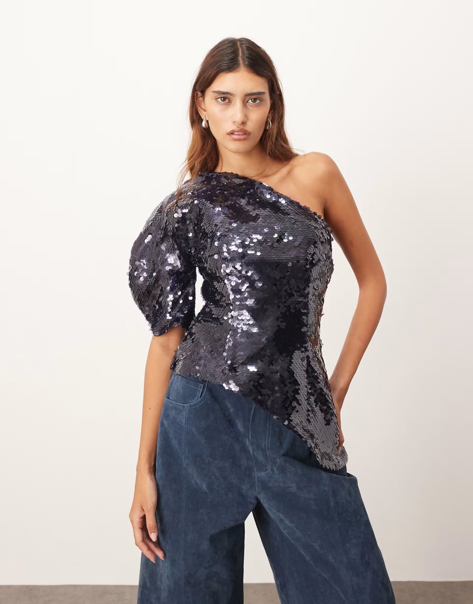 The ASOS Sculptural One Shoulder Sequin Top in Navy is ideal for evening, formal, party.