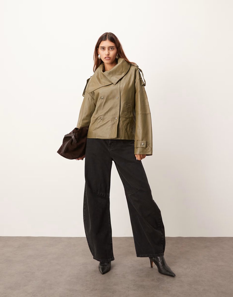 The ASOS ARRANGE Olive Green Leather Jacket is ideal for casual, work.