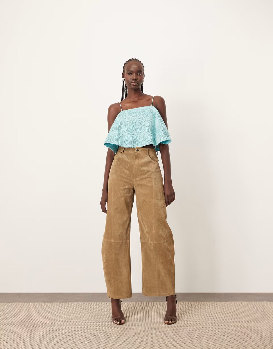 The ASOS Arrange Suede High Waisted Barrel Trouser in Tobacco is available in sizes XXXL, XXL, XL, XS, L, M, S.