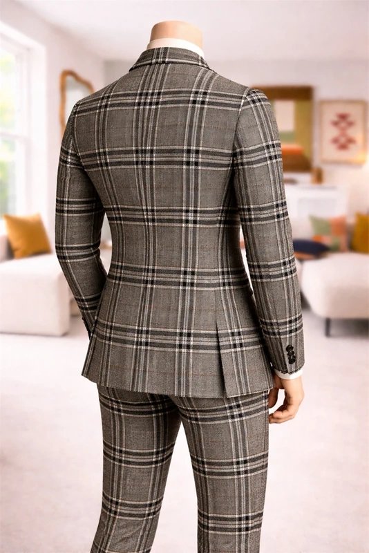 Brown Plaid Double Breasted Men's Suit — the perfect choice for formal events. Designed with brown plaid, double breasted, long sleeve, slim fit, wool blend. Features classic, formal style for a sophisticated look.