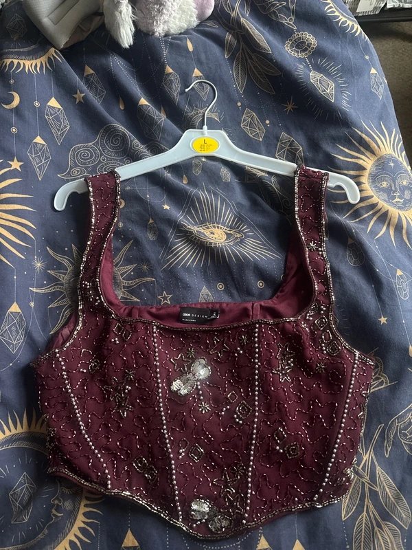 The ASOS Beaded Corset Top in Burgundy is available in sizes S.