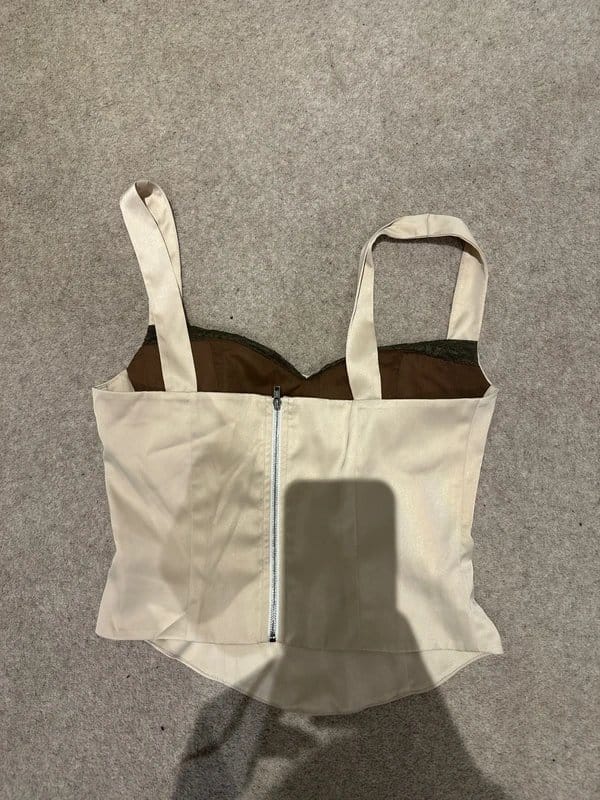 Stylish beige corset crop top by ASOS. Features a criss-cross front design with a zipper closure and adjustable straps. Perfect for a bohemian chic look.