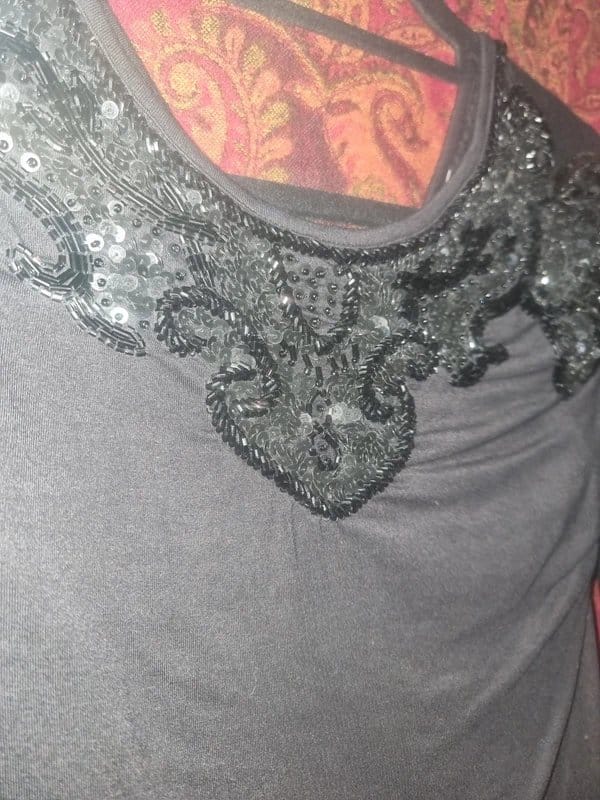 The black beaded bodysuit features a long sleeve design with a cut out back. It's a stylish piece perfect for evening outings or a night in.